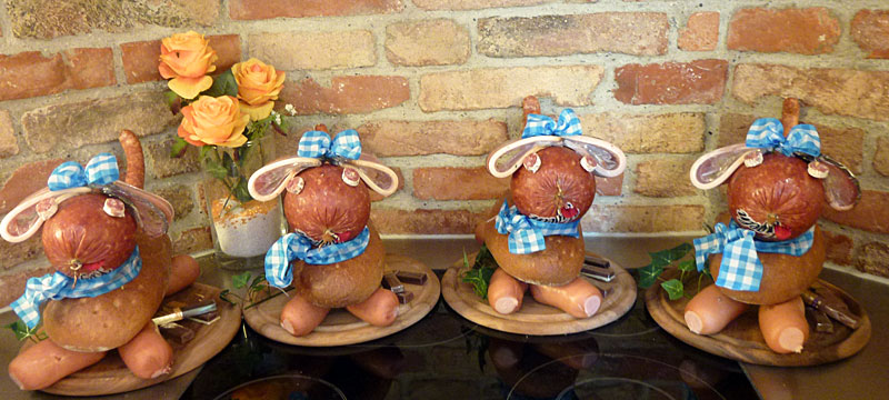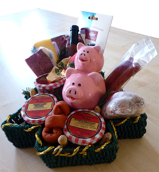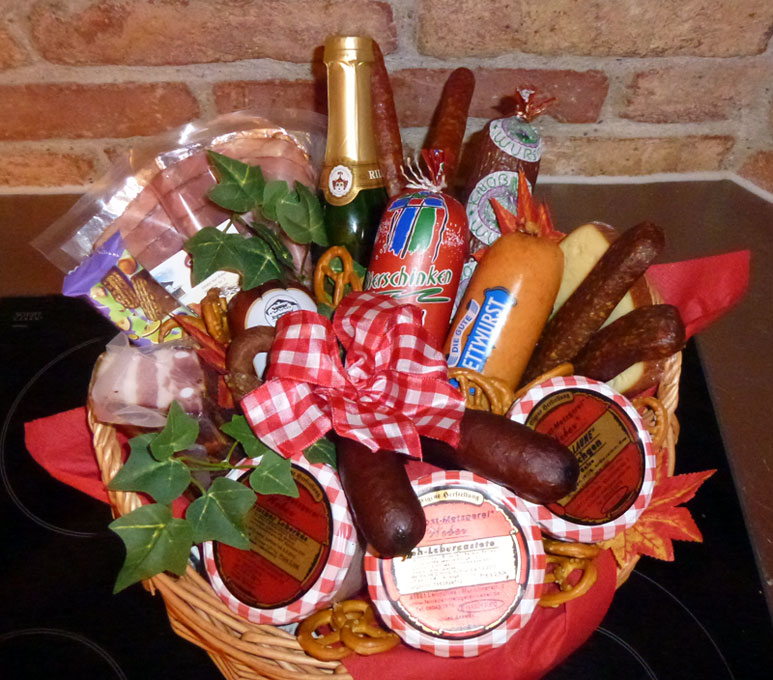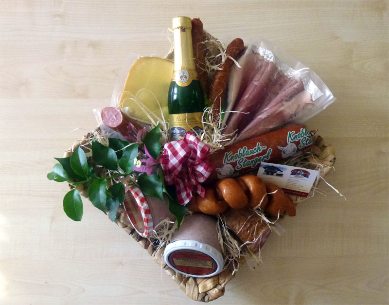 Sind Sie auf der Suche nach einem passenden Geschenk? Wir lassen uns etwas für Sie einfallen! Geschenkkörbe, Wurststräuße oder Überraschungsplatten sind immer eine willkommene Aufmerksamkeit für die ganze Familie, Arbeitskollegen, Jubilare, Freunde und Bekannte. Wir bestücken die Geschenkkörbe nach Ihren Wünschen von "pikant" bis "süß". Auch an Getränke wird gedacht!